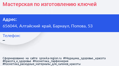 Мастерская по изготовлению ключей по адресу 656044, Алтайский край, Барнаул, Попова, 53 в дальнейшем Организация, размещена в следующих категориях: