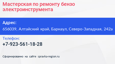 Мастерская по ремонту бензо электроинструмента по адресу 656039, Алтайский край, Барнаул, Северо-Западная, 242а в дальнейшем Организация, размещена в следующих категориях: