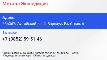 Металл Экспедиция по адресу 656067, Алтайский край, Барнаул, Взлётная, 61 в дальнейшем Организация, размещена в следующих категориях:
