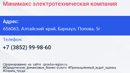 Минимакс, электротехническая компания по адресу 656063, Алтайский край, Барнаул, Попова, 5г в дальнейшем Организация, размещена в следующих категориях:
