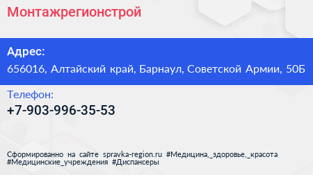 Монтажрегионстрой по адресу 656016, Алтайский край, Барнаул, Советской Армии, 50Б в дальнейшем Организация, размещена в следующих категориях: