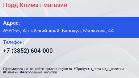 Норд-Климат, магазин по адресу 656055, Алтайский край, Барнаул, Малахова, 44 в дальнейшем Организация, размещена в следующих категориях: