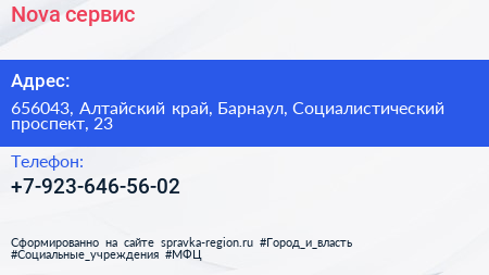 Nova сервис по адресу 656043, Алтайский край, Барнаул, Социалистический проспект, 23 в дальнейшем Организация, размещена в следующих категориях: