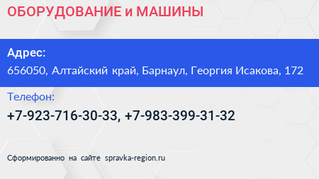 ОБОРУДОВАНИЕ и МАШИНЫ по адресу 656050, Алтайский край, Барнаул, Георгия Исакова, 172 в дальнейшем Организация, размещена в следующих категориях:
