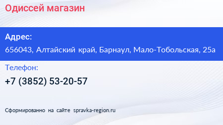 Одиссей, магазин по адресу 656043, Алтайский край, Барнаул, Мало-Тобольская, 25а в дальнейшем Организация, размещена в следующих категориях:
