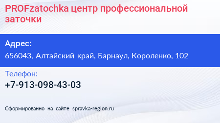 PROFzatochka, центр профессиональной заточки по адресу 656043, Алтайский край, Барнаул, Короленко, 102 в дальнейшем Организация, размещена в следующих категориях: