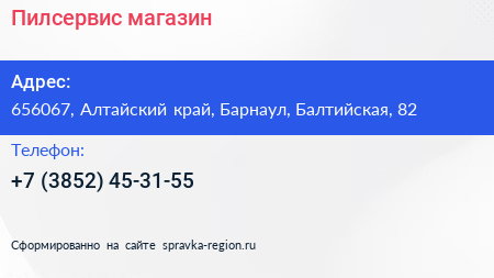 Пилсервис, магазин по адресу 656067, Алтайский край, Барнаул, Балтийская, 82 в дальнейшем Организация, размещена в следующих категориях: