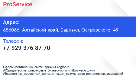 ProService по адресу 656066, Алтайский край, Барнаул, Островского, 49 в дальнейшем Организация, размещена в следующих категориях: