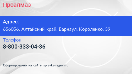 Проалмаз по адресу 656056, Алтайский край, Барнаул, Короленко, 39 в дальнейшем Организация, размещена в следующих категориях: