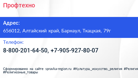 Профтехно по адресу 656012, Алтайский край, Барнаул, Ткацкая, 79г в дальнейшем Организация, размещена в следующих категориях: