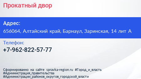 Прокатный двор по адресу 656064, Алтайский край, Барнаул, Заринская, 14 лит А в дальнейшем Организация, размещена в следующих категориях: