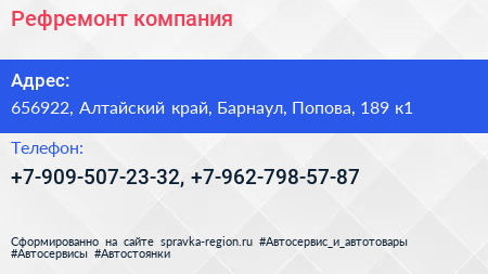 Рефремонт, компания по адресу 656922, Алтайский край, Барнаул, Попова, 189 к1 в дальнейшем Организация, размещена в следующих категориях: