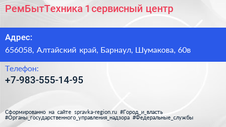 РемБытТехника №1, сервисный центр по адресу 656058, Алтайский край, Барнаул, Шумакова, 60в в дальнейшем Организация, размещена в следующих категориях: