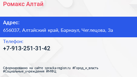 Ромакс-Алтай по адресу 656037, Алтайский край, Барнаул, Чеглецова, 3а в дальнейшем Организация, размещена в следующих категориях: