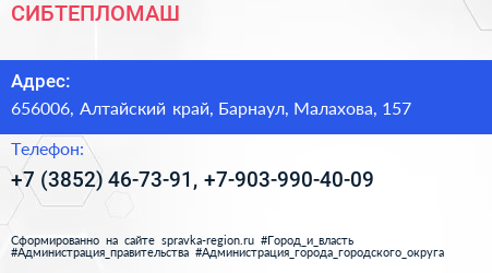 СИБТЕПЛОМАШ по адресу 656006, Алтайский край, Барнаул, Малахова, 157 в дальнейшем Организация, размещена в следующих категориях: