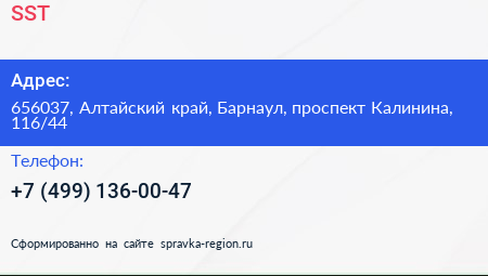 SST по адресу 656037, Алтайский край, Барнаул, проспект Калинина, 116/44 в дальнейшем Организация, размещена в следующих категориях: