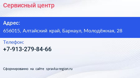 Сервисный центр по адресу 656015, Алтайский край, Барнаул, Молодёжная, 28 в дальнейшем Организация, размещена в следующих категориях: