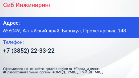 Сиб Инжиниринг по адресу 656049, Алтайский край, Барнаул, Пролетарская, 148 в дальнейшем Организация, размещена в следующих категориях: