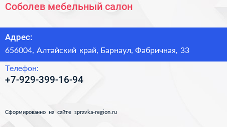 Соболев, мебельный салон по адресу 656004, Алтайский край, Барнаул, Фабричная, 33 в дальнейшем Организация, размещена в следующих категориях: