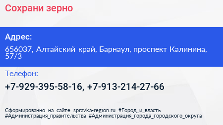 Сохрани зерно по адресу 656037, Алтайский край, Барнаул, проспект Калинина, 57/3 в дальнейшем Организация, размещена в следующих категориях: