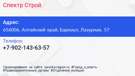 Спектр-Строй по адресу 656006, Алтайский край, Барнаул, Лазурная, 57 в дальнейшем Организация, размещена в следующих категориях: