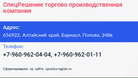 СпецРешение, торгово-производственная компания по адресу 656922, Алтайский край, Барнаул, Попова, 248в в дальнейшем Организация, размещена в следующих категориях: