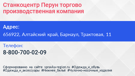 Станкоцентр Перун, торгово-производственная компания по адресу 656922, Алтайский край, Барнаул, Трактовая, 11 в дальнейшем Организация, размещена в следующих категориях: