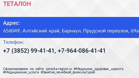 ТЕТАЛОН по адресу 656049, Алтайский край, Барнаул, Прудской переулок, 69а в дальнейшем Организация, размещена в следующих категориях: