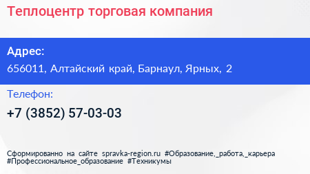 Теплоцентр, торговая компания по адресу 656011, Алтайский край, Барнаул, Ярных, 2 в дальнейшем Организация, размещена в следующих категориях: