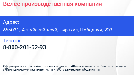 Велес, производственная компания по адресу 656031, Алтайский край, Барнаул, Победная, 203 в дальнейшем Организация, размещена в следующих категориях: