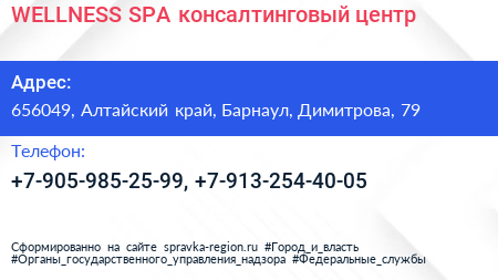 WELLNESS SPA, консалтинговый центр по адресу 656049, Алтайский край, Барнаул, Димитрова, 79 в дальнейшем Организация, размещена в следующих категориях: