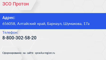 ЗСО Протон по адресу 656058, Алтайский край, Барнаул, Шумакова, 17а в дальнейшем Организация, размещена в следующих категориях: