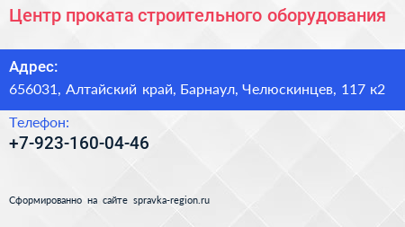 Центр проката строительного оборудования по адресу 656031, Алтайский край, Барнаул, Челюскинцев, 117 к2 в дальнейшем Организация, размещена в следующих категориях: