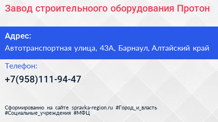 Завод строительноого оборудования Протон по адресу Автотранспортная улица, 43А, Барнаул, Алтайский край в дальнейшем Организация, размещена в следующих категориях: