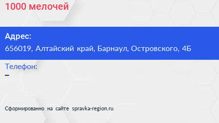 1000 мелочей по адресу 656019, Алтайский край, Барнаул, Островского, 4Б в дальнейшем Организация, размещена в следующих категориях: