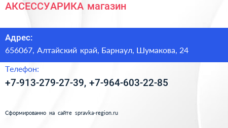 АКСЕССУАРИКА, магазин по адресу 656067, Алтайский край, Барнаул, Шумакова, 24 в дальнейшем Организация, размещена в следующих категориях:
