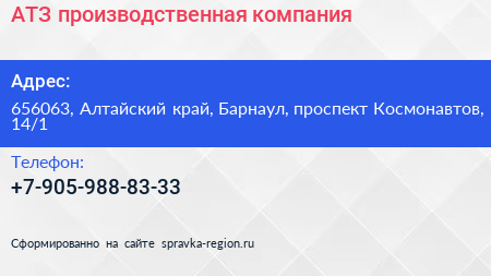 АТЗ, производственная компания по адресу 656063, Алтайский край, Барнаул, проспект Космонавтов, 14/1 в дальнейшем Организация, размещена в следующих категориях: