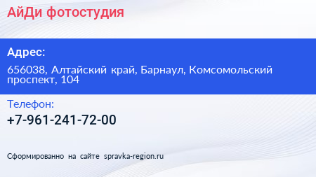 АйДи, фотостудия по адресу 656038, Алтайский край, Барнаул, Комсомольский проспект, 104 в дальнейшем Организация, размещена в следующих категориях: