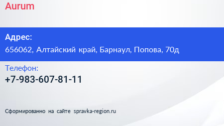 Аurum по адресу 656062, Алтайский край, Барнаул, Попова, 70д в дальнейшем Организация, размещена в следующих категориях: