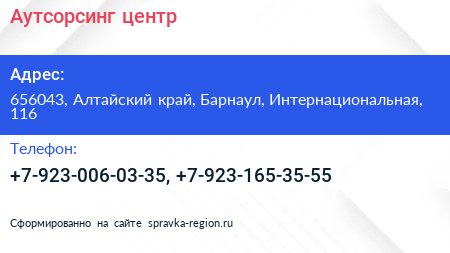 Аутсорсинг центр по адресу 656043, Алтайский край, Барнаул, Интернациональная, 116 в дальнейшем Организация, размещена в следующих категориях: