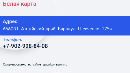 Белая карта по адресу 656031, Алтайский край, Барнаул, Шевченко, 175а в дальнейшем Организация, размещена в следующих категориях: