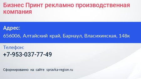 Бизнес-Принт, рекламно-производственная компания по адресу 656006, Алтайский край, Барнаул, Власихинская, 148к в дальнейшем Организация, размещена в следующих категориях: