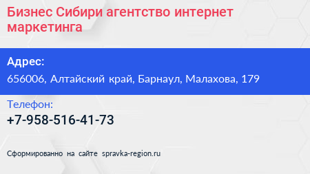Бизнес Сибири, агентство интернет-маркетинга по адресу 656006, Алтайский край, Барнаул, Малахова, 179 в дальнейшем Организация, размещена в следующих категориях: