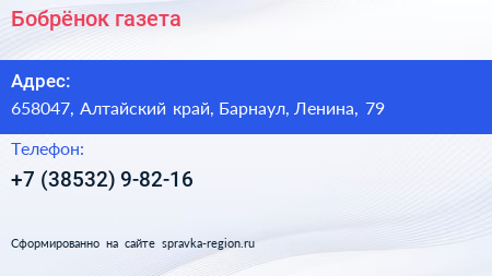 Бобрёнок, газета по адресу 658047, Алтайский край, Барнаул, Ленина, 79 в дальнейшем Организация, размещена в следующих категориях: