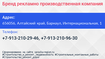 Бренд, рекламно-производственная компания по адресу 656056, Алтайский край, Барнаул, Интернациональная, 1 в дальнейшем Организация, размещена в следующих категориях: