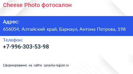 Cheese Photo, фотосалон по адресу 656054, Алтайский край, Барнаул, Антона Петрова, 198 в дальнейшем Организация, размещена в следующих категориях: