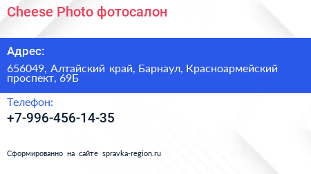 Cheese Photo, фотосалон по адресу 656049, Алтайский край, Барнаул, Красноармейский проспект, 69Б в дальнейшем Организация, размещена в следующих категориях: