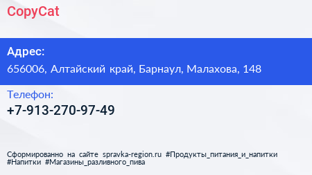 CopyCat по адресу 656006, Алтайский край, Барнаул, Малахова, 148 в дальнейшем Организация, размещена в следующих категориях: