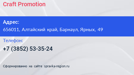 Craft Promotion по адресу 656011, Алтайский край, Барнаул, Ярных, 49 в дальнейшем Организация, размещена в следующих категориях: