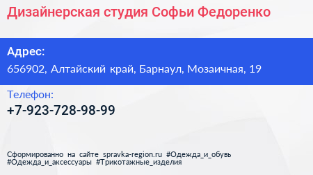 Дизайнерская студия Софьи Федоренко по адресу 656902, Алтайский край, Барнаул, Мозаичная, 19 в дальнейшем Организация, размещена в следующих категориях: